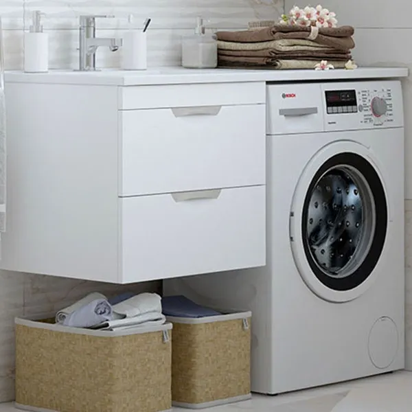 - Подвесная тумба с раковиной обеспечивает легкость монтажа и экономию пространства, позволяя разместить стиральную машину.