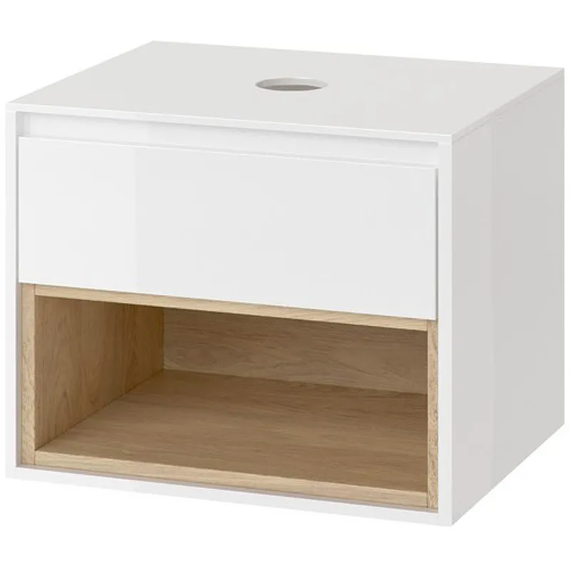 Подвесная тумба под раковину Excellent Tuto 60 MLEX.0102.600.WHBL. Предназначена для использования в ванных комнатах с повышенной влажностью.Технические данные: Цвет: белый, дуб. Фасад и корпус: ЛДСП и МДФ. Отделения: 1 выдвижной ящик с системой Soft Close и одна открытая полочка. Размеры (ШхДхВ): 60x49,4x45,7 см. Монтаж: подвесной, крепление к стене. В комплекте поставки: тумба под раковину, комплект креплений.