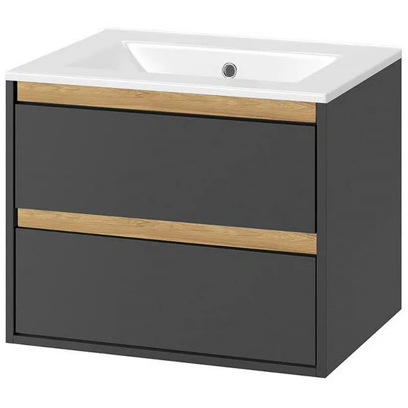Подвесная тумба под раковину Excellent Tuto 60 MLEX.0103.600.GRBL. Предназначена для использования в ванных комнатах с повышенной влажностью.Технические данные: Цвет: серый, дуб. Фасад и корпус: ЛДСП и МДФ. Корпус и фасад: окрашены Eco лаками устойчивыми к царапинам, температуре и излучению. Система хранения: 2 выдвижных ящика с доводчиком. Ящики оснащены бесшумной системой выдвижения Soft Close, которая замедляет закрытие. Используются навесы итальянской фирмы Camar, которые соответствуют допустимой нагрузке до 600 кг. Размеры (ШхДхВ): 60x45,7x500 см. Монтаж: на стену. В комплекте поставки: тумба под раковину, комплект креплений.