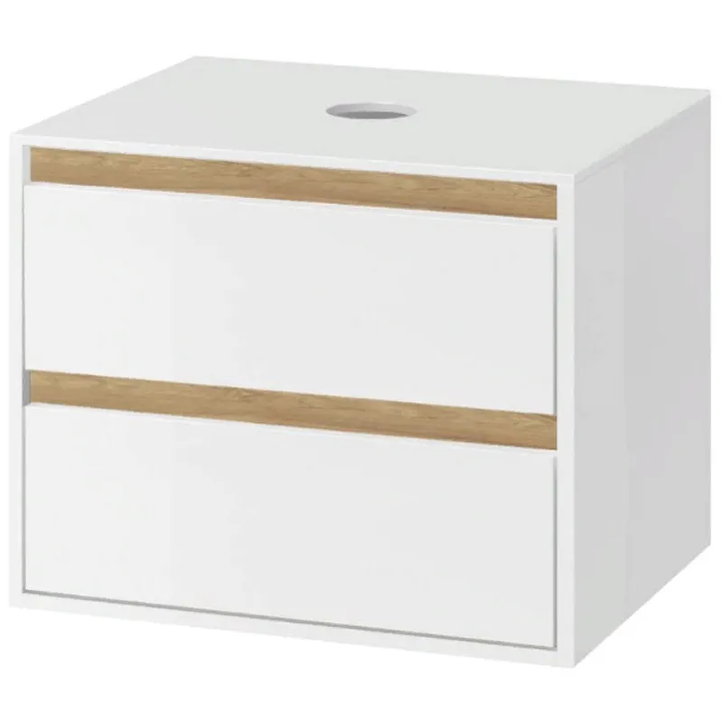 Подвесная тумба под раковину Excellent Tuto 60 MLEX.0104.600.WHBL. Предназначена для использования в ванных комнатах с повышенной влажностью.Технические данные: Цвет: белый, дуб. Фасад и корпус: ЛДСП и МДФ. Отделения: 2 выдвижных ящика с системой Soft Close. Размеры (ШхДхВ): 60x49,4x45,7 см. Монтаж: подвесной, крепление к стене. В комплекте поставки: тумба под раковину, комплект креплений.