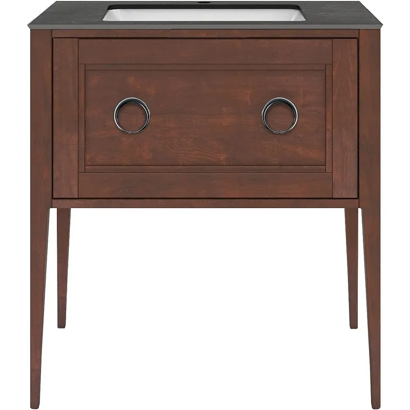 - Классический стиль для ванной комнаты: Тумба выполнена в ореховом цвете, что придаёт интерьеру изысканность и уют.