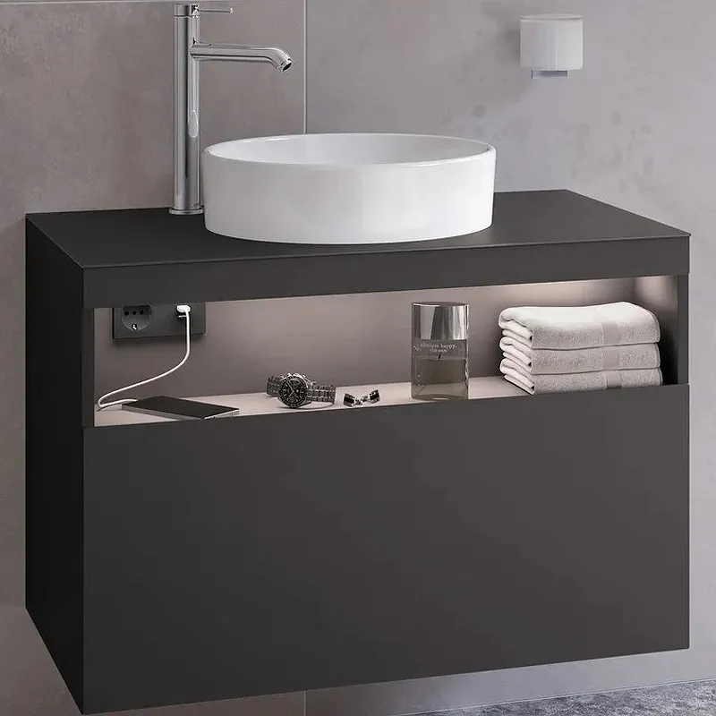 Тумба под раковину Keuco Stageline 80 32864970100 подвесная с подсветкой.Характеристики: Цвет: вулканит. Материал: МДФ. Система хранения: выдвижной ящик с доводчиком, открытая полка. Оснащение: pозеткa, USB. Отверстие под смеситель слева, 35 мм. Размеры (ШхВхГ): 800х549х490 мм. Монтаж: подвесной. В комплекте поставки: Тумба под раковину. Пластиковый сифон 1 1/4 x 32. Антискользящий коврик.