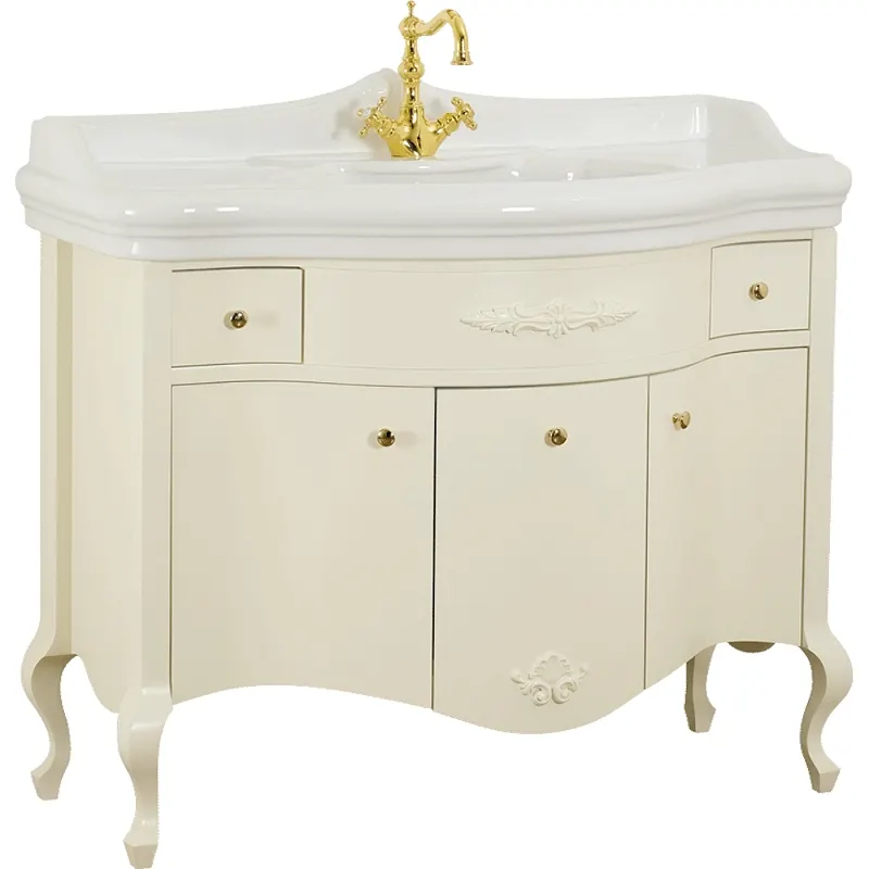 Тумба под раковину Migliore Impero 110 25955 — идеальное решение для создания элегантного интерьера в ванной. Эта напольная тумба с раковиной, выполненная в классическом стиле, отличается высоким качеством и изысканным дизайном. Изготовленная из массива бука и МДФ, тумба имеет матовую поверхность и покрыта эмалью цвета слоновой кости, что придаёт ей утончённый вид и долговечность.