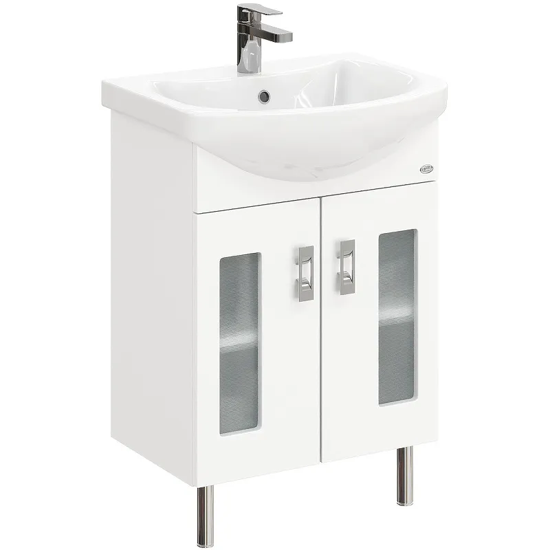 Тумба под раковину Onika Кристалл 55.18 105555.Характеристики: Цвет: белый. Материал корпуса: ЛДСП. Покрытие корпуса: ламинирование. Материал фасада: МДФ, стекло. Покрытие фасада: пленка. Габариты тумбы (ШхВхГ): 52х68х29,6 см. Габариты с раковиной (ШхВхГ): 55х83х45,2 см. Установка: напольная. Система хранения: 2 распашные дверцы, полки. Механизм плавного закрытия дверей. Фурнитура цвет: хром. В комплекте поставки: Тумба под раковину. Ручки - 2 шт. Ножки - 3 шт. (2 декоративных хромированных и 1 пластиковая).