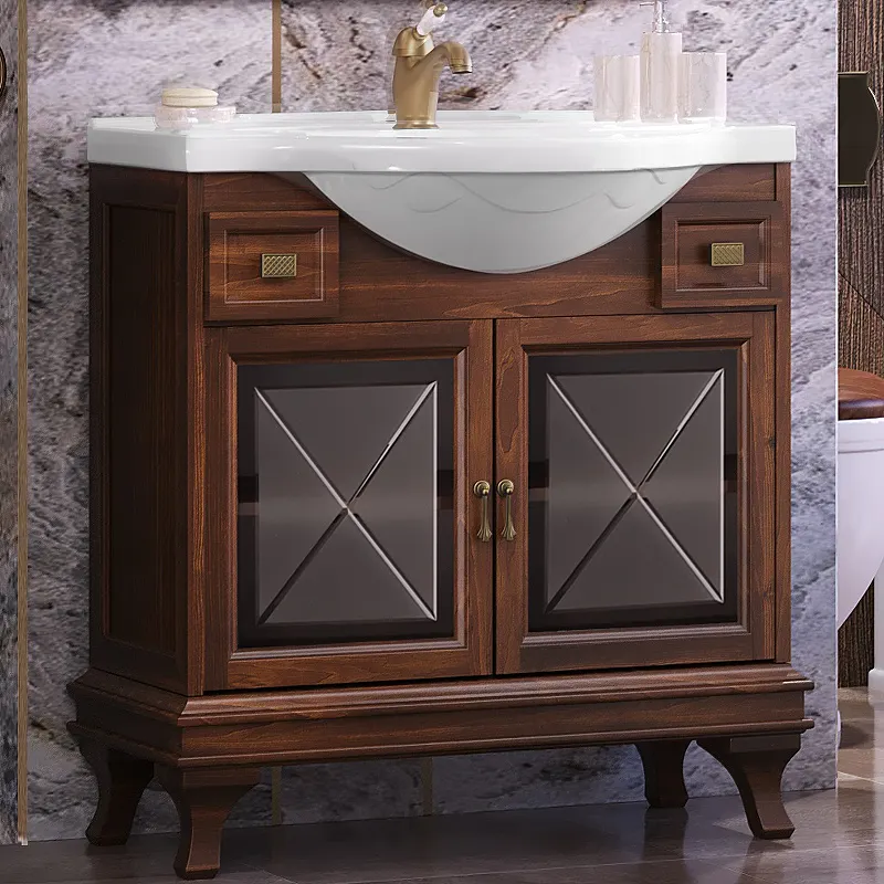 Тумба под раковину Opadiris Борджи 85 00-00006743 напольная.Характеристики: Цвет: светлый орех. Материал корпуса и фасада: массив бука, стекло. Покрытие корпуса и фасада: морёное дерево. Габариты корпуса тумбы (ШхВхД): 870х827х332 мм. Система хранения: две распашные дверцы, выдвижные ящики. Оснащение: дверцы с доводчиками (плавное закрывание). Цвет фурнитуры: бронза. Монтаж: напольный. В комплекте поставки: Тумба под раковину.