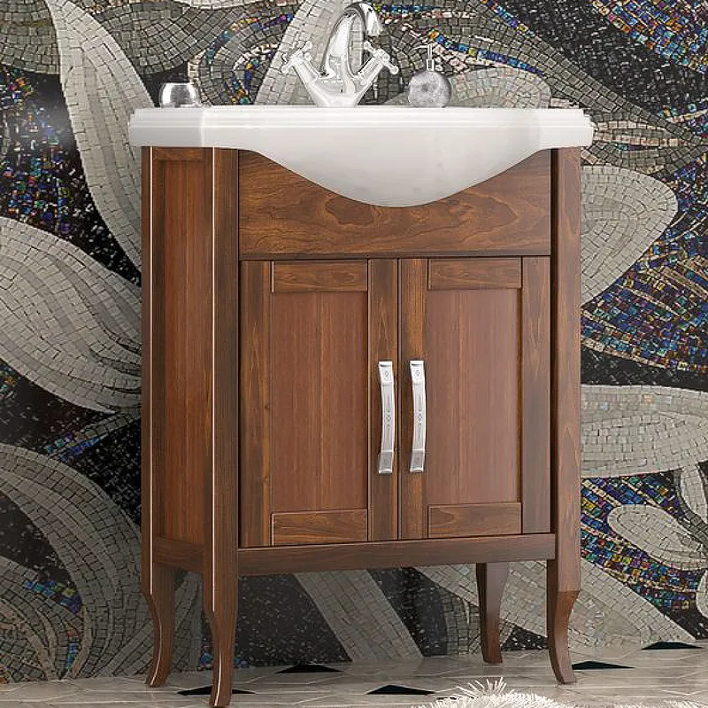 - Эстетичный дизайн мебели для ванной комнаты: светлый орех и античное серебро фурнитуры добавляют изысканности.
