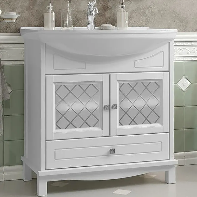 Тумба под раковину Opadiris Омега 75 00-00007357.Элегантные и лаконичные формы изделия идеально впишутся в любой интерьер в стиле прованс. Фасадные элементы украшены оригинальными ромбовидными узорами стеклянных витражей. Данная модель позволит эргономично разместить необходимые принадлежности. Тумба оснащена механизмами плавного закрывания Hettich (Германия).Характеристики: Цвет: белый матовый. Материал фасада: массив бука, стекло. Материал корпуса: массив бука, МДФ, ЛДСП. Покрытие: матовая эмаль. Цвет лицевой фурнитуры: античное серебро. Система хранения: распашные дверцы, ящик. Оснащение: дверцы и ящик с доводчиками (плавное закрывание). Размеры тумбы (ШхВхД): 740х800х341 мм. Монтаж: напольный. В комплекте поставки: Тумба под раковину.