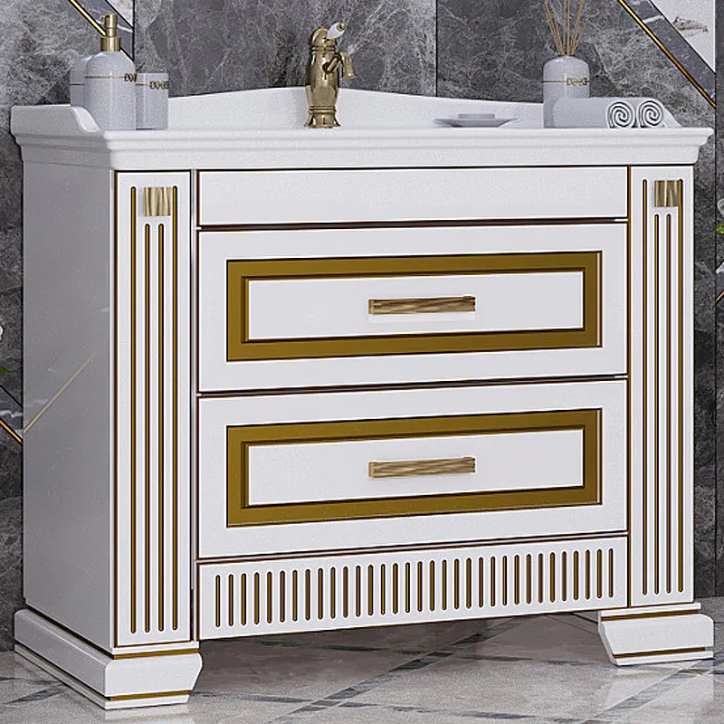 Тумба под раковину Opadiris Оникс 100 00-00003548. Станет шикарным элементом в интерьере ванной комнаты. Превосходно подходит как для классического, так и для современного стиля. Роскошный фасад выполнен с глубокой фрезеровкой с патиной, а также дополнен удобными ручками-скобами.Характеристики: Цвет: белый глянцевый с золотой патиной. Материал фасада/корпуса: МДФ. Два выдвижных вместительных ящика с направляющими для плавного и бесшумного выдвижения/закрывания. Ручки в цвете золото. Монтаж: напольный. В комплекте поставки: тумба под раковину.