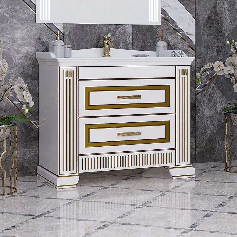 - Элегантный дизайн: Глянцевый белый фасад с золотой патиной подчеркнёт изысканный стиль вашей ванной комнаты.