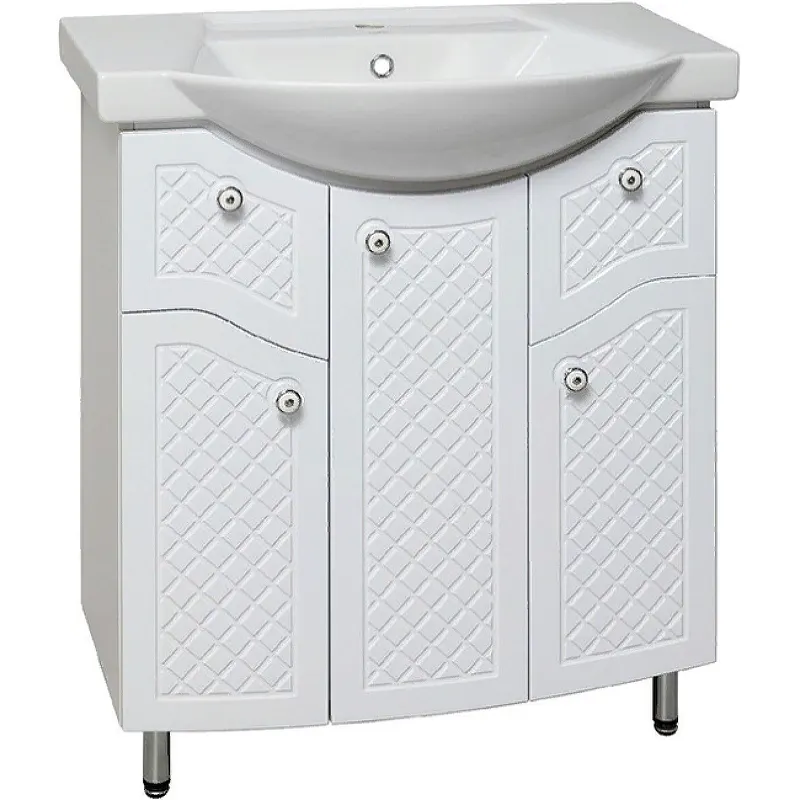 Тумба под раковину Runo Милано 75 УТ000002088 Белая — идеальное решение для стандартной ванной комнаты. Данная тумба выполнена в классическом стиле, что делает её универсальным выбором для квартир. Напольная установка на ножках обеспечивает устойчивость и лёгкость в уходе, а влагостойкий ЛДСП и МДФ гарантируют долговечность и устойчивость к влаге.