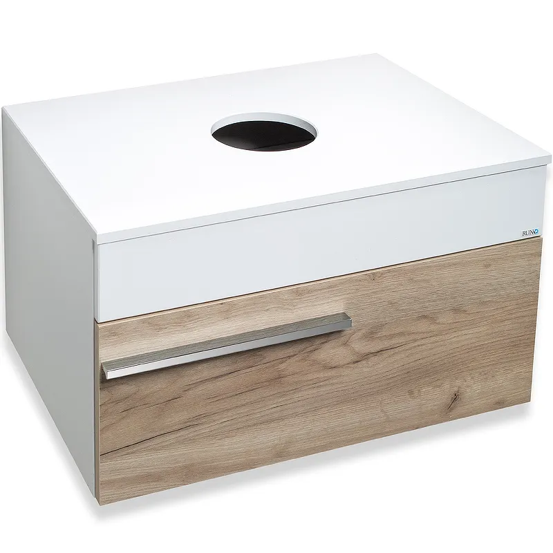 Тумба под раковину Runo Вудлайн 65 00-00001342 — идеальное решение для современной ванной комнаты. Подвесная конструкция обеспечивает удобный доступ и легкость в уборке, а универсальное отверстие на столешнице позволяет использовать различные варианты накладных раковин с глубокой чашей. Изготовленная из влагостойкого ЛДСП и МДФ, данная тумба гарантирует долговечность и устойчивость к влаге.