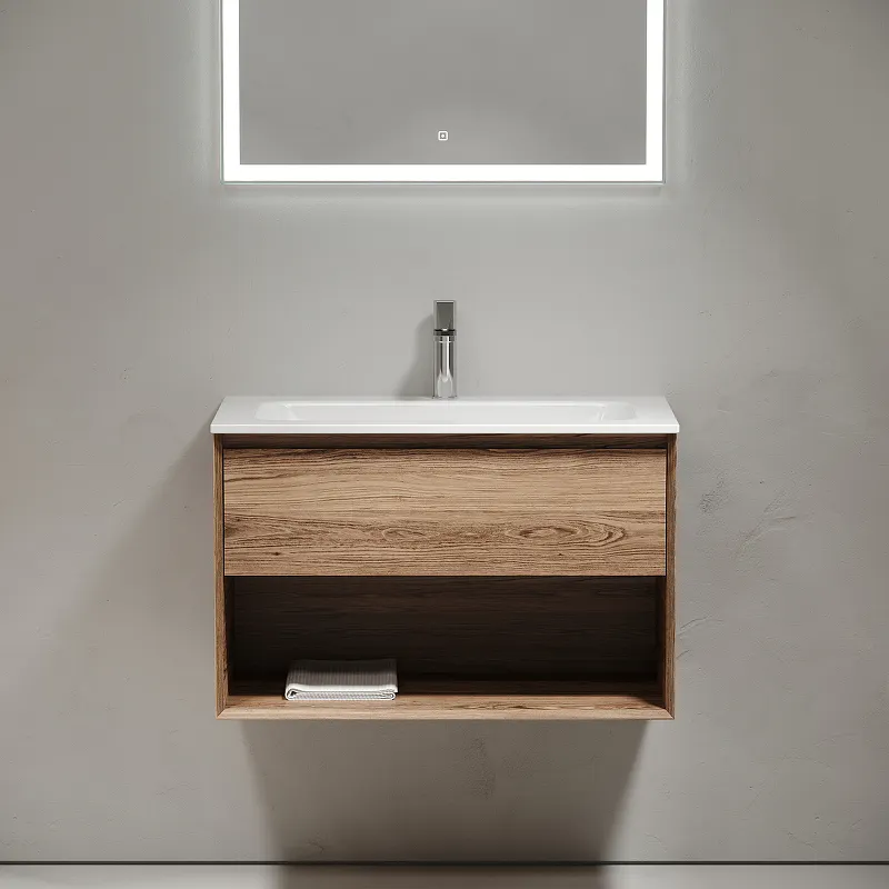 - Современный стиль: Подвесная тумба с древесным узором идеально вписывается в интерьер ванной комнаты.