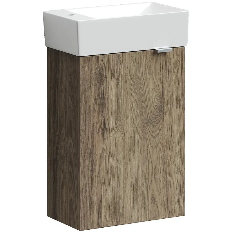 Тумба под раковину Sancos Mini 37 L MN35ECHL подвесная с распашной дверцей.Характеристики: Цвет: Дуб чарльстон. Монтаж: подвесной. Материал фасада: ЛДСП. Поверхность фасада: матовая. Материал корпуса: ЛДСП.Покрытие корпуса: ламинат. Размеры тумбы (ШхВхГ): 355x500x205 мм. Расположение петель: справа. Система хранения: 1 полка. Механизм доводчика скрытого монтажа. В комплекте поставки: Тумба под раковину. Комплект доводчиков. Комплект креплений. Инструкция.