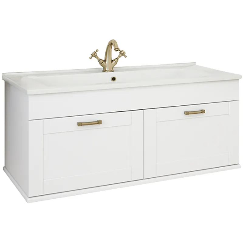- Элегантный дизайн: Белая матовая поверхность и бронзовая фурнитура создают изысканный внешний вид, подходящий для любого стиля ванной комнаты.