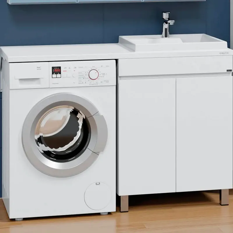 - Рациональное использование пространства: Напольная установка и место для стиральной машины делают тумбу функциональной и практичной.