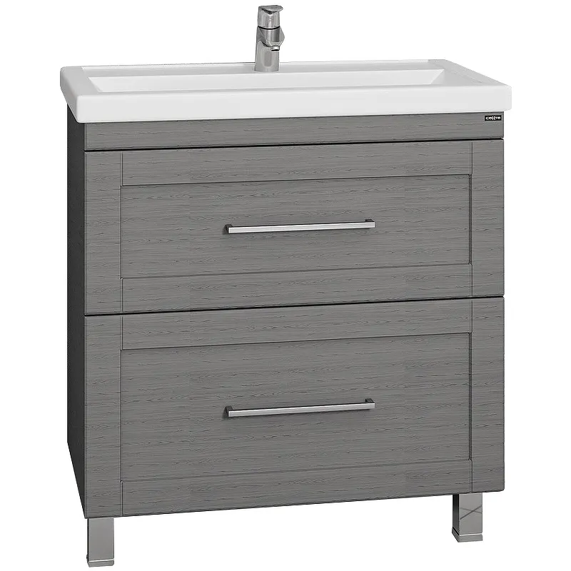 Тумба под раковину СанТа Венера 80 221017.Технические данные: Цвет: дуб серый. Корпус и фасад: МДФ. Покрытие: ПВХ пленка. Габариты корпуса тумбы (ШхВхГ): 77 х 75 х 43,5 см. Система хранения: 2 выдвижных ящика полного выдвижения с плавным закрыванием. Фурнитура в цвете хром. Монтаж: напольный, на ножках. В комплекте поставки: тумба под раковину, ручки 2 шт, ящик с механизмом плавного закрывания 2 шт.