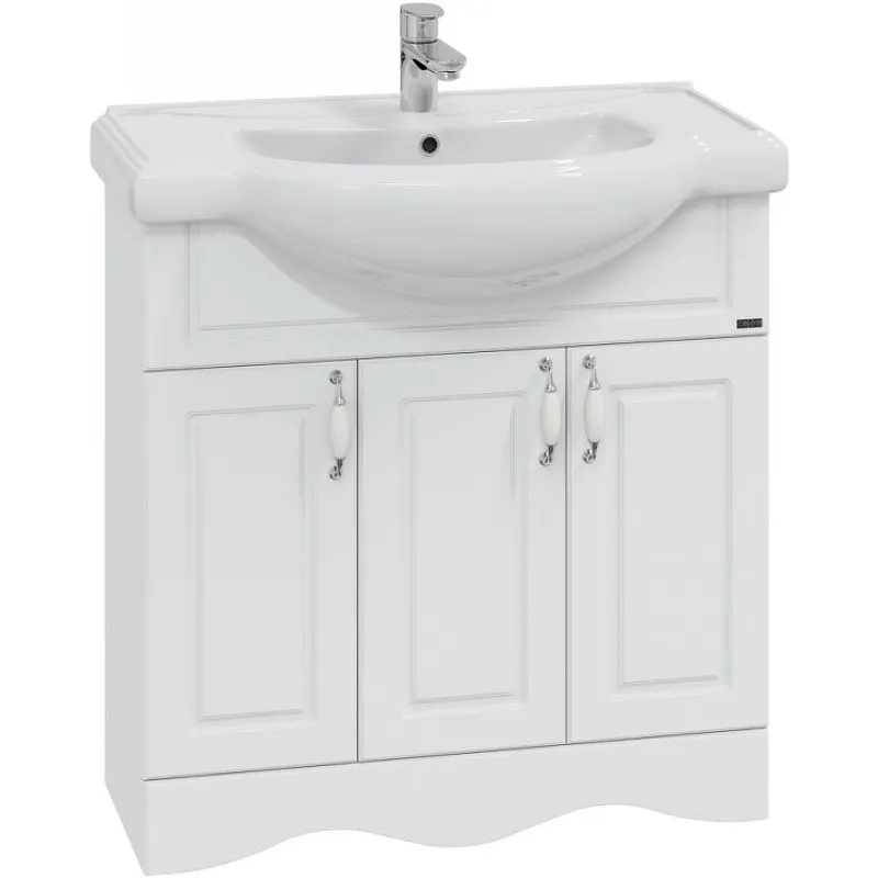 Тумба под раковину СанТа Верона 80 700113 Белая идеально подходит для обустройства ванной комнаты в классическом стиле. Изготовленная из влагостойкого ЛДСП и МДФ, она обеспечивает долговечность и надежность. Напольная установка и стильный белый цвет делают данную тумбу универсальным решением для любой квартиры.