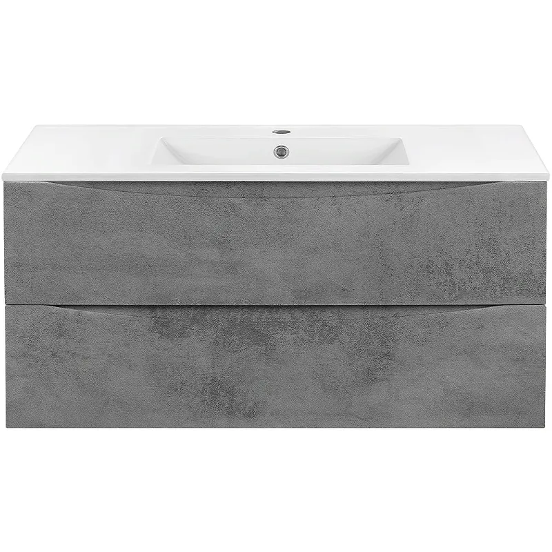 Тумба под раковину Vincea Mia 100 VMC-2MC100BT.Характеристики: Цвет: Beton (серый). Габариты (ШхВхГ): 1006х500х460 мм. Материал: ДСП. Тип покрытия: пленка ПВХ. Система хранения: 2 выдвижных ящика с доводчиками soft-close (плавного закрывания). Ручки: интегрированные в плоскости фасада. Установка: подвесная. В комплекте поставки: тумба под раковину.