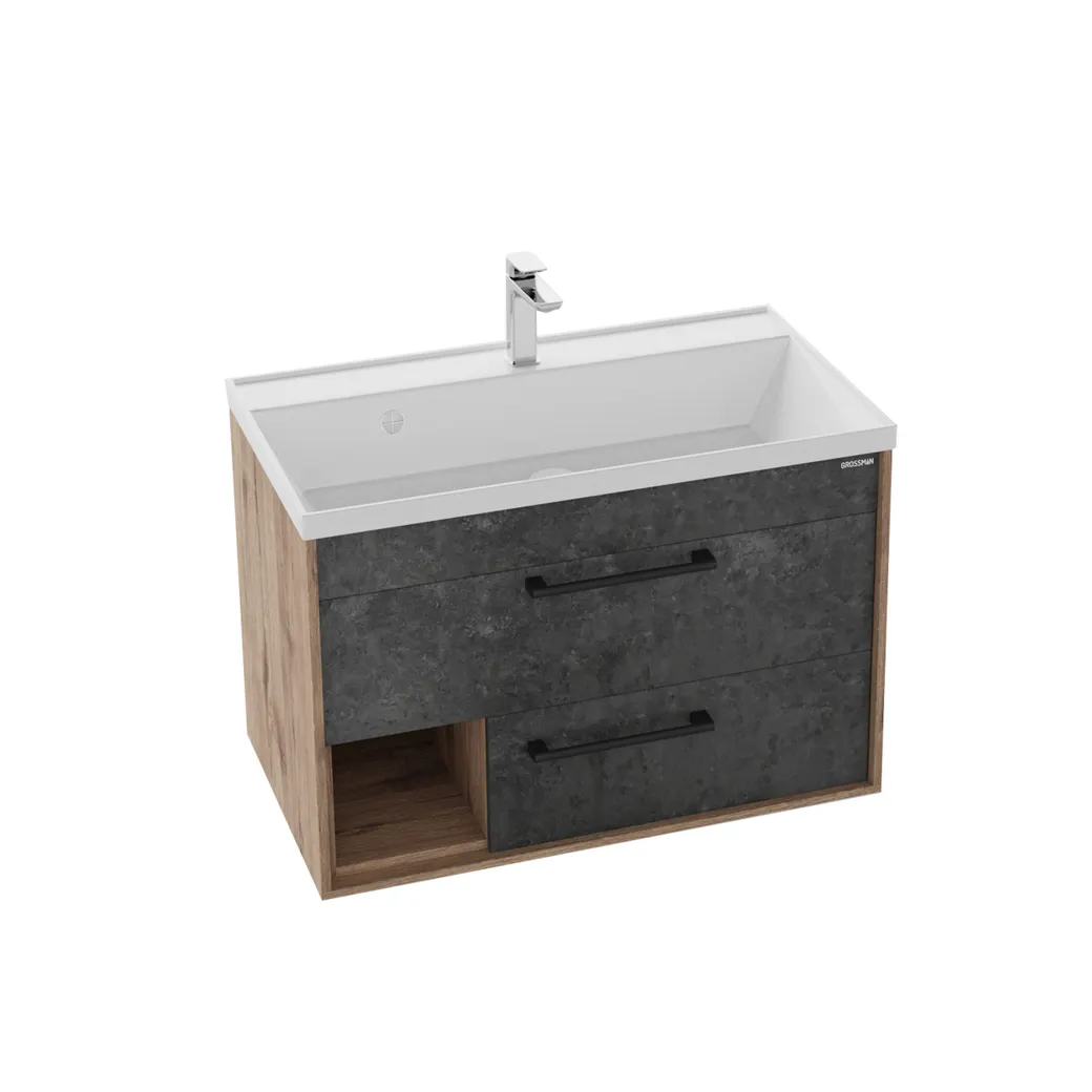 Тумба подвесная Реал 80 см - функциональное, стильное и практичное исполнение. Фасады в цвете бетон безупречно сочетается с фактурой под дерево и позволяет тумбе органично вписаться в интерьер ванной комнаты в стиле лофт и модерн. Тумба снабжена выдвижными ящиком, которые укомплектованы шариковыми направляющими с системой плавного закрывания. Дополнительное открытое отделение с полкой позволит расширить место для хранения и предоставляет быстрый доступ к ванным принадлежностям. Корпус тумбы выполнен из влагостойкого ЛДСП, фасады ящиков и двери - из МДФ в матовой пленке, устойчивых к перепадам температур и высокой влажности, крепится к стене. Подвесы для крепления тумбы - в комплекте.