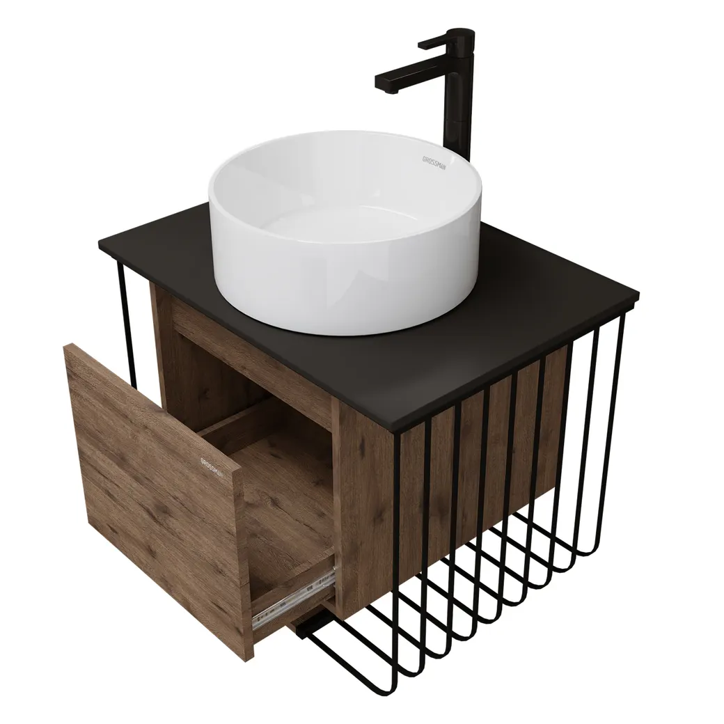 Тумба подвесная Винтаж 70 см решает задачу грамотной и компактной организации хранения вещей, сохранив при этом уютный интерьер. Тумбу обрамляют черные металлические конструкции,которые служат не только декором, но и являются дополнительным местом для хранения текстиля. Выдвижной ящик вмещает в себя аксессуары и предметы гигиены разных габаритов. Корпус тумбы выполнен из влагостойкого ЛДСП, фасады ящиков - из МДФ в структурной пленке, столешница из МДФ ПВХ черный матовый устойчивых к перепадам температур и высокой влажности, крепится к стене. Подвесы для крепления тумбы - в комплекте.