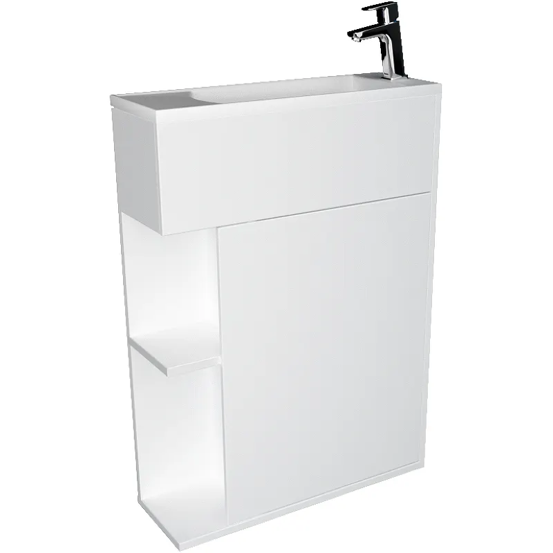 - Эффективная система хранения: Тумба с раковиной оснащена распашной дверцей и двумя открытыми полками для удобного хранения.