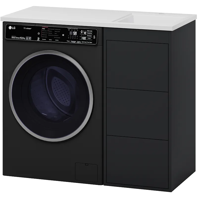Тумба с раковиной Brevita Grafit 100 R — идеальное решение для современной ванной комнаты. Данный комплект предназначен для установки над стиральной машиной, что позволяет рационально использовать пространство. Корпус и фасады выполнены из МДФ с матовым покрытием, придающим изделию стильный графитовый оттенок.