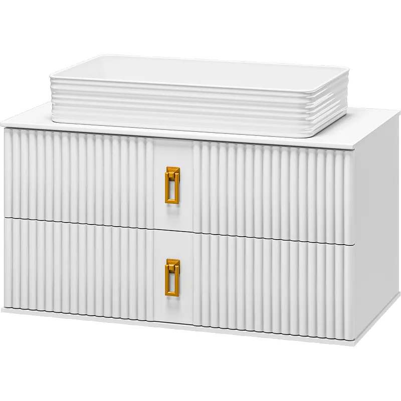- Подвесная тумба с раковиной 90 см позволяет эффективно использовать пространство в ванной комнате, создавая ощущение легкости и простора.