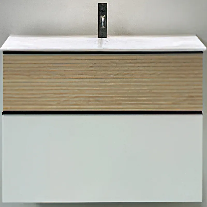 Тумба с раковиной Burgbad Fiumo 80 SFXN082F3956FOT45G0200C0001*1.Характеристики: Цвет верхнего ящика: Eiche Dekor Cashmere. Цвет корпуса и нижнего ящика: белый матовый. Цвет ручек: черный матовый. Материал: МДФ. Габариты (ШхВхД): 820 x 610 x 490 мм. Установка: подвесная. Система хранения: 2 выдвижных ящика с механизмом плавного закрытия. Цвет раковины: белый. Материал раковины: искусственный камень. Форма: прямоугольная. Отверстие под смеситель: 1. В комплекте поставки: Тумба. Раковина.