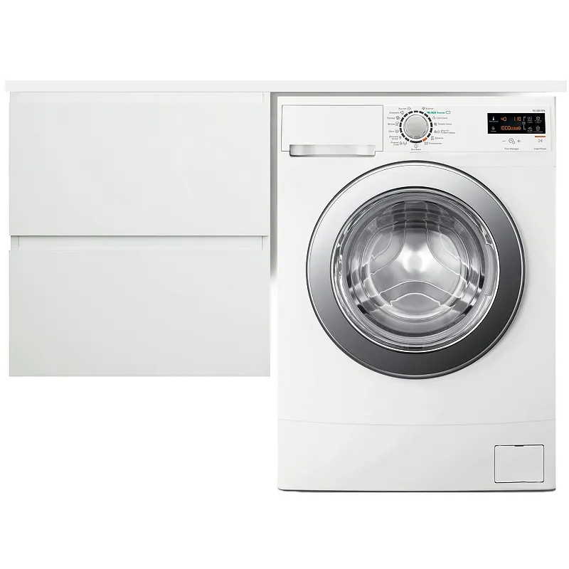 - Место для стиральной машины позволяет компактно разместить бытовую технику, сохраняя общий стиль помещения.