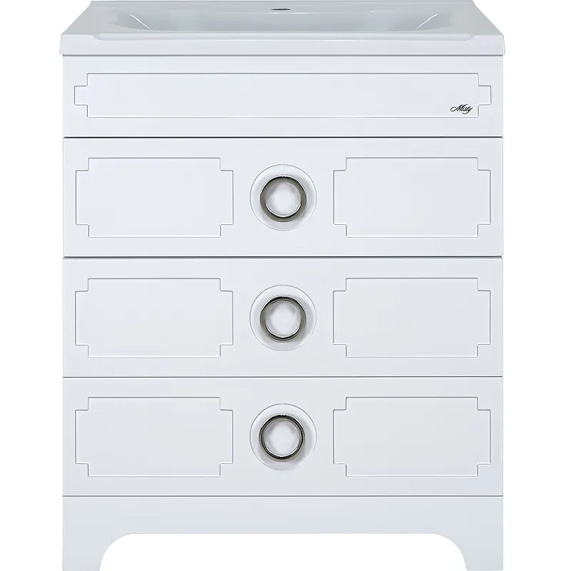 • Элегантный и современный стиль: Тумба с раковиной выполнена в белом цвете с хромированными ручками, что добавляет изысканности.