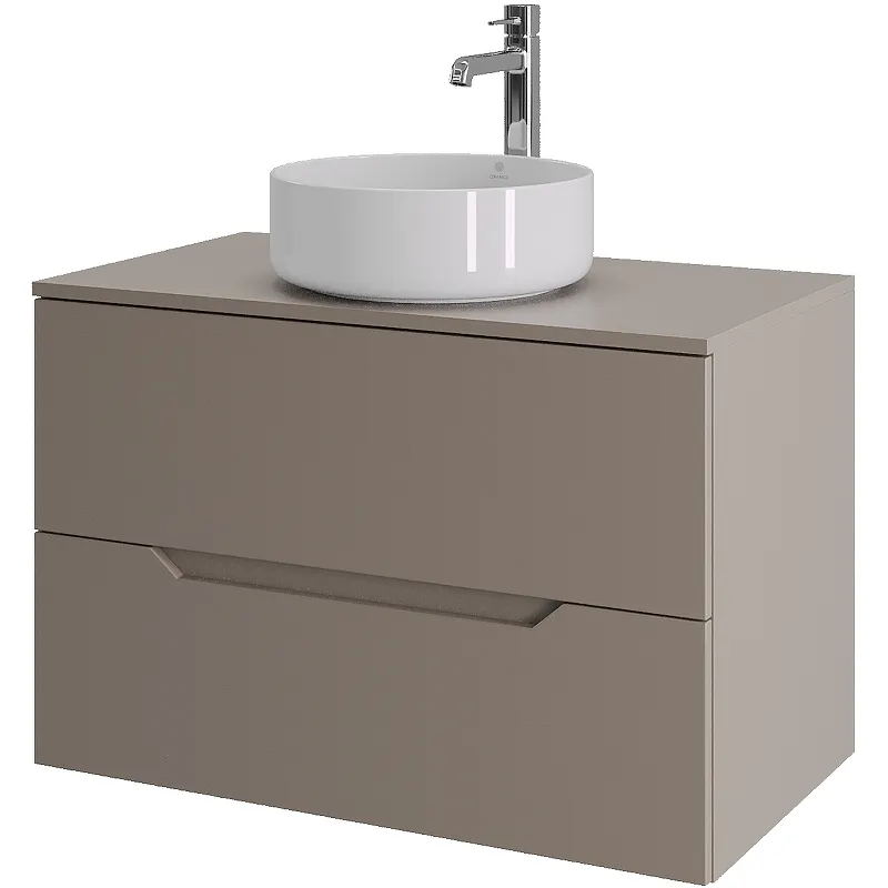 Тумба с раковиной Orange Line 80 Li-80TuLMDF+B09-360W подвесная.Тумба подвесная с накладной раковиной Orange Line отличается современным дизайном. Изготовлена из МДФ высокой плотности. Мебель покрыта пленкой ПВХ с технологией Soft Touch - ламинация класса премиум, с повышенными тактильными свойствами. Пленка обеспечивает дополнительную защиту мебели от влаги и перепадов температуры. На ящики установлены комплекты скрытых направляющих Hettich, обеспечивающие полное выдвижение и имеющие встроенную систему плавного и бесшумного закрывания.Отверстия в столешнице под раковину и смеситель монтируются самостоятельно.Характеристики:Тумба со столешницей: Цвет: латте матовый. Материал корпуса и фасада: МДФ. Материал столешницы: МДФ. Покрытие корпуса и фасада: пленка ПВХ. Толщина материала фасада: 16 мм. Габариты корпуса тумбы (ШхВхД): 805х540х460 мм. Интегрированные ручки. Система хранения: два выдвижных ящика. Оснащение: механизм доводчика. Монтаж: подвесной. Раковина-чаша: Цвет: белый глянцевый. Материал: фарфор. Размер (ШхВхГ): 360х120х360 мм. Форма: круглая. Диаметр сливного отверстия: 45 мм. Монтаж: накладной (на столешницу). В комплекте поставки: Тумба под раковину со столешницей. Раковина-чаша B09-360W. Комплект фурнитуры. Инструкция.