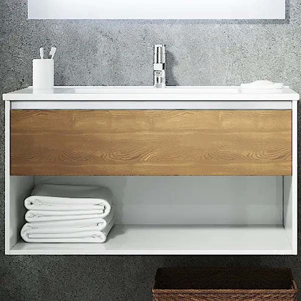 - Вместительная система хранения с открытыми полками и ящиком с полным выдвижением.
