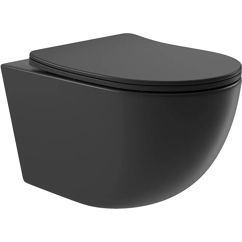 Унитаз подвесной Aqueduto Ovo OVO0140 — стильное решение для современных ванных комнат. Черный матовый цвет и безободковая конструкция подчеркивают его элегантность, а монтаж с инсталляцией делает его идеальным выбором для тех, кто ценит порядок и стиль.