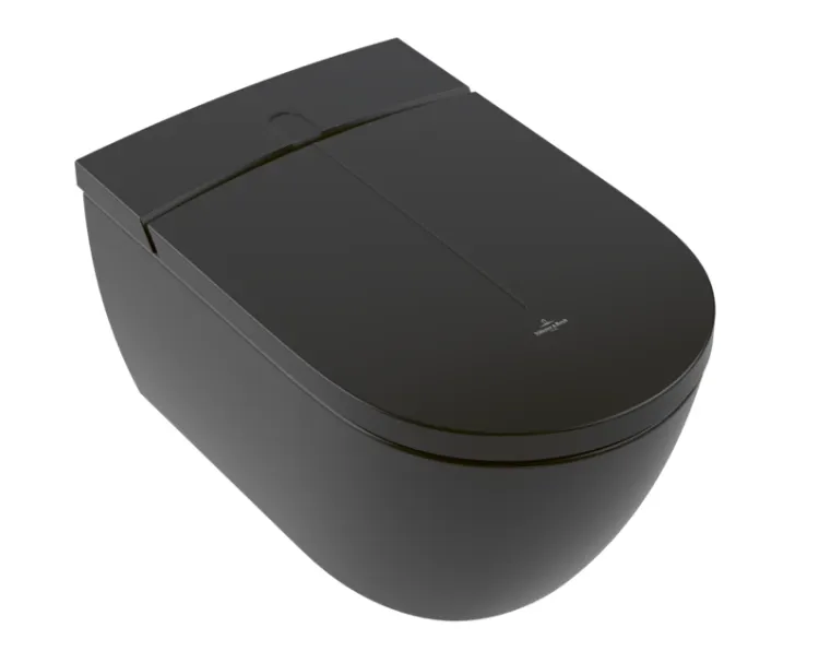 Унитаз, Villeroy&Boch, Viclean, безободковый (с открытым смывным краем), тип установки-подвесной, ширина, мм-385, глубина, мм-595, высота, мм-360, форма чаши-овальная, выпуск-горизонтальный, сиденье с функцией биде-в комплекте, вид грязеотталкивающего покрытия-CeramicPlus, цвет-Pure Black арт-V0E100R7