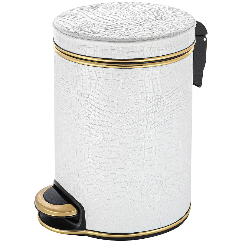 Ведро для мусора Geralis V-KWG-B Croco с педалью.Характеристики: Цвет: белый. Кант: золото. Материал: экокожа, ABS-пластик, металл. Габариты (ШхВхД): 210х290х260 мм. Объем: 5 л. Плавное закрывание крышки. Внутри мусорного ведра, съемное пластиковое ведро с ручкой. Надежный педальный механизм открытия крышки. Монтаж: напольный.