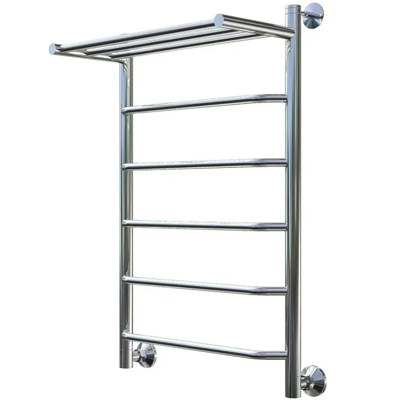 - Полотенцесушитель с полочкой обеспечивает удобство для размещения дополнительных вещей.