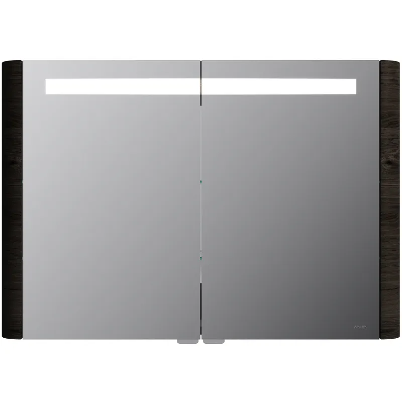 Зеркальный шкаф в ванную AM.PM Sensation 100 M30MCX1001TF с двумя распашными дверцами и двумя полками за ними, с подсветкой сверху, с розеткой и выключателем. Материал: МДФ, шпон, стекло. Фактурная поверхность корпуса. Петли оснащены доводчиками для плавного закрывания. Размеры: 1000x150x700 мм. LED 16W/12V/IP44. В комплекте поставки: зеркальный шкаф.