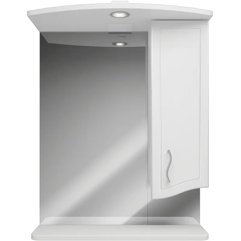 Зеркало со шкафом DIWO Переславль 60 R PER.Z.60/P/W с подсветкой.Характеристики: Цвет: белый. Материал корпуса: ДСП. Материал фасада: МДФ. Поверхность корпуса: ламинат матовый. Поверхность фасада: пленка глянцевая. Габариты (ШхВхГ): 60x75x26 см. Система хранения: 1 распашная дверца, открытая полка снизу. Петли с системой плавного закрывания. Монтаж: подвесной. Ориентация шкафа: правая. Фурнитура цвет: серебро. Механический выключатель, розетка. Светодиодная лампа. В комплекте поставки: Зеркало со шкафом. Подвесы.