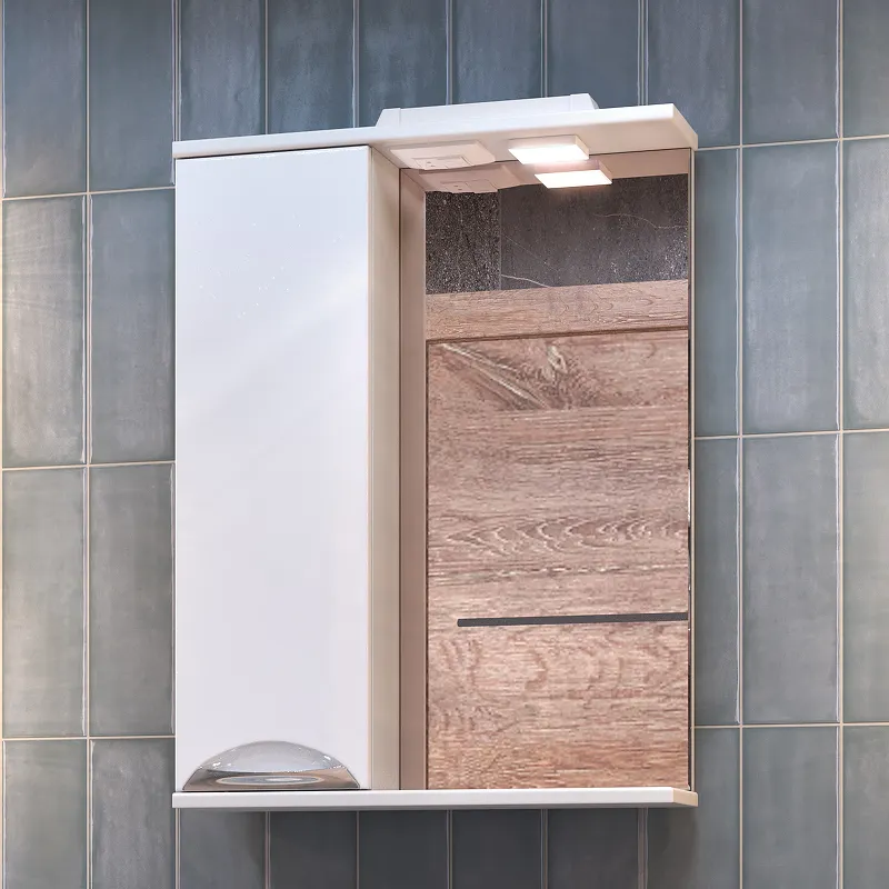 - Современный стиль и функциональность: Данное зеркало со шкафом гармонично вписывается в интерьер современной ванной комнаты, обеспечивая удобство и элегантный вид.