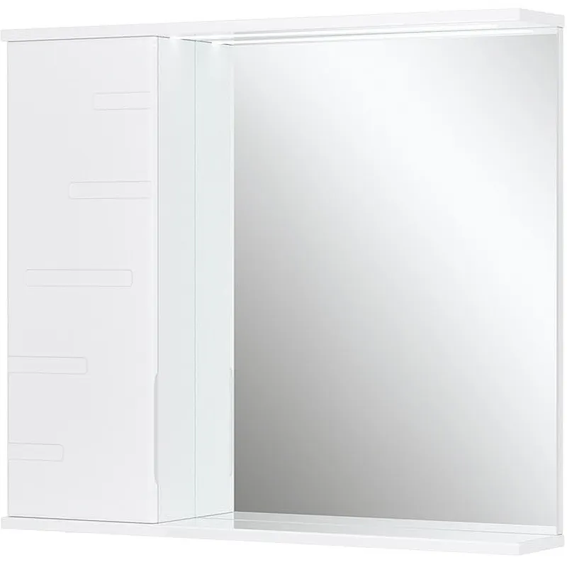 Зеркало со шкафом Volna Joli 80 L zsJOLI80.L-01 с подсветкой.Характеристики: Цвет: белый. Материал фасада: МДФ, зеркальное полотно. Материал корпуса: ЛДСП. Покрытие фасада: пленка глянцевая ПВХ. Покрытие корпуса: ламинат матовый. Размер (ШхВхГ): 800х700х146 мм. Декоративна фрезеровка на фасаде. Интегрированная ручка. Встроенная светодиодная подсветка. Тип выключателя: электровыключатель. Мощность лампы: 6000 W. Ориентация: шкафчик слева. Оснащения: механизм доводчика. Система хранения: распашная дверца, полки внутри шкафа, открытая полка снизу. Монтаж: подвесной. В комплекте поставки: Зеркало со шкафом. Стеклянные полки - 2 шт. Подсветка. Выключатель. Электрическая розетка.
