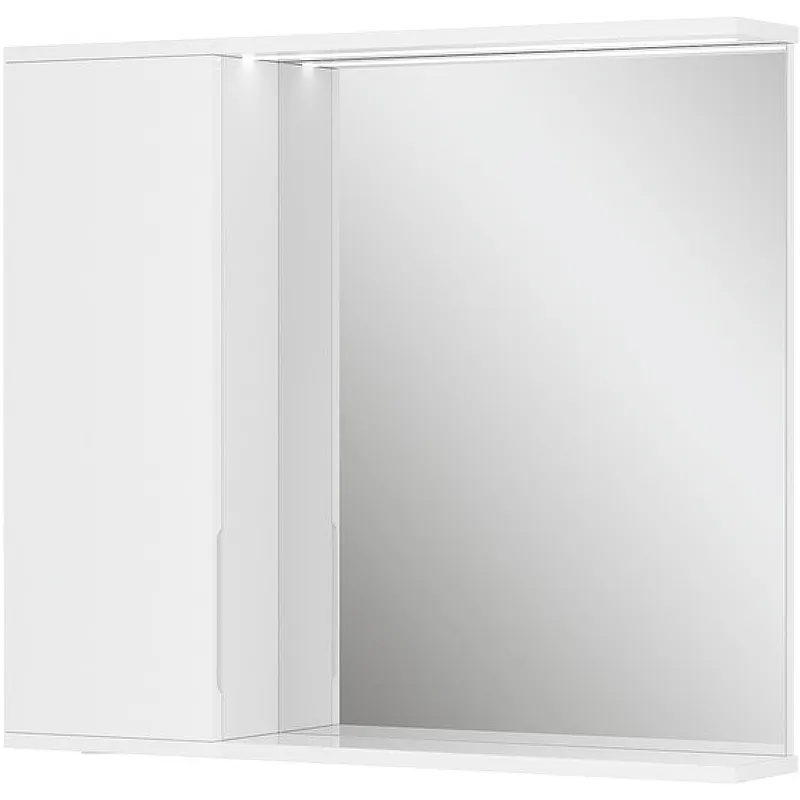Зеркало со шкафом Volna Lake 80 L zsLAKE80.L-01 с подсветкой.Характеристики: Цвет: белый. Материал фасада: МДФ, зеркальное полотно. Материал корпуса: ЛДСП. Покрытие фасада: пленка глянцевая ПВХ. Покрытие корпуса: ламинат матовый. Размер (ШхВхГ): 800х700х146 мм. Интегрированная ручка. Встроенная светодиодная подсветка. Тип выключателя: электровыключатель. Мощность лампы: 6000 W. Ориентация: шкафчик слева. Оснащения: механизм доводчика. Система хранения: распашная дверца, полки внутри шкафа, открытая полка снизу. Монтаж: подвесной. В комплекте поставки: Зеркало со шкафом. Стеклянные полки - 2 шт. Подсветка. Выключатель. Электрическая розетка.