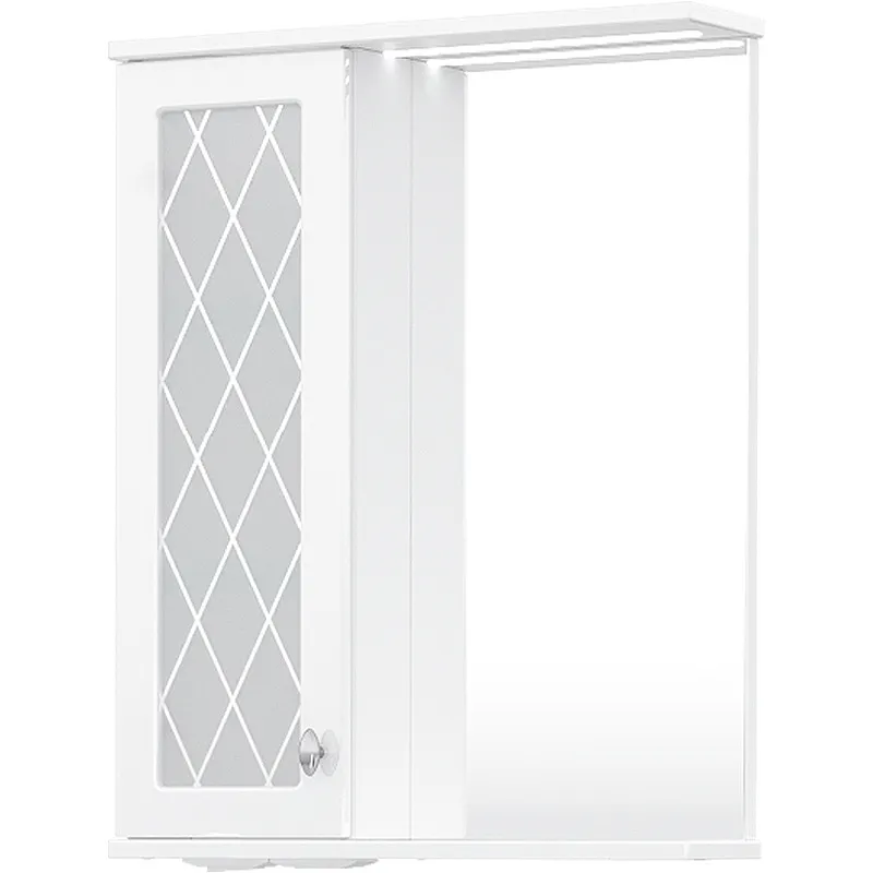 Зеркало со шкафом Volna Milena 55 L zsMLN55.L-01 с подсветкой.Характеристики: Цвет: белый. Материал фасада: МДФ, зеркальное полотно. Материал корпуса: ЛДСП. Покрытие фасада: пленка глянцевая ПВХ. Покрытие корпуса: ламинат матовый. Цвет фурнитуры: хром. Размер (ШхВхГ): 550х700х146 мм. В дверце установлена вставка из зеркального полотна с рисунком амальгамой. Встроенная светодиодная подсветка. Тип выключателя: электровыключатель. Мощность лампы: 6000 W. Ориентация: шкафчик слева. Оснащения: механизм доводчика. Система хранения: распашная дверца, полки внутри шкафа, открытая полка снизу. Монтаж: подвесной. В комплекте поставки: Зеркало со шкафом. Стеклянные полки - 2 шт. Подсветка. Выключатель. Электрическая розетка.