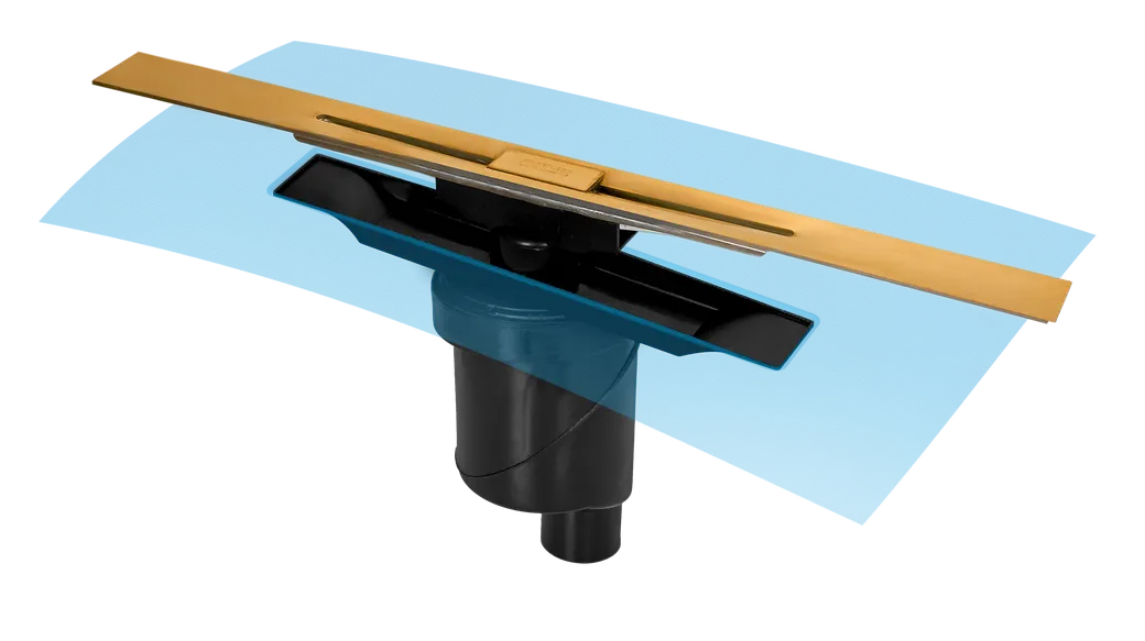 Решетка-желоб водосток, нержавеющая сталь AISI 304 Декоративная заглушка с сеткой для волос, нержавеющая сталь AISI 304 Переходник, PP Корпус PP c гидроизоляцией Самопромывной S-образный сифон PP: вертикальный выпуск D50/105 H50, пропускная способность 42л/мин, монтаж 360° Монтажные углы и ключ, пластик